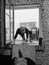 Inga: Štai kodėl mums su Andriumi sekasi sutarti – mudviem viskas ekspromtu pavyksta. Mes nusprendėme, kad reikia fotosesijos, pradėti rinktis medžiagą, kurią būtų galima vėliau panaudoti prisistatymui. Pasišnekėjome, fotografavomės, fotosesijos metu kilo mintis tiesiog įlipti pro langą. O kodėl gi ne? Galerija mus įleidžia.