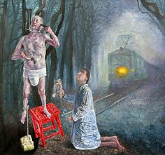 Drobėje pavaizduota auka „Saukos veidu“, bet šiuo atveju mums svarbiau dailininko nutapytas rūkas. Galerijos vadovas Alvydas Stauskas maloniai sutiko padaryti drobės nuotrauką. Ji šioje publikacijoje – lyg netiesioginė tapytojo dovana aktorei.