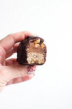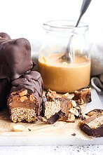 Švelni datulių karamelė, traškus pagrindas, sūrūs žemės riešutai ir šokoladas. Šie veganiški „Snickers“ batonėliai yra tarsi skani svajonė.