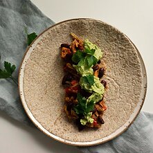 Tortilijas galite trumpai (2 min.) pašildyti orkaitėje, kad būtų traškios. Ant tortilijos dedame troškinto duonvaisio (stengiamės be skystimo), pupelių, gvakamolės. Patiekti galite su kalendra ar petražolėmis.