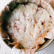 Į kepimo formą pirmame sluoksnyje dedame dalį keptuvės turinio, tada balto padažo ir makaronų lakštus.