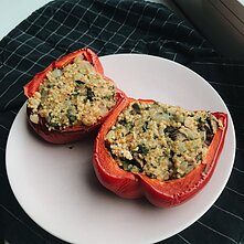 1. Paprikas perpjaukite pusiau ir kepkite su aliejumi 30–40 minučių, kol karamelizuosis, 180 °C laipsnių temperatūroje.
