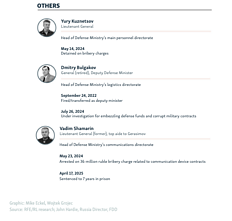 Tyrėjai – daugiausia Federalinės saugumo tarnybos (FSB) atstovai – kartu su prokurorais ir Vidaus reikalų ministerijos pareigūnais vis dažniau imasi veiksmų prieš gynybos viceministrus, aukšto rango karininkus ir aukščiausius civilinius pareigūnus, pateikdami įtarimų dėl korupcijos, sukčiavimo, turto pasisavinimo ir kitų nusikaltimų.