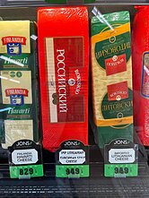Ant vieno iš sūrių galinės etiketės, kurią matė ir LRT.lt, jau anglų kalba nurodoma „Cheese Rokiskio Russian“ – „Sūris Rokiškio rusiškas“.