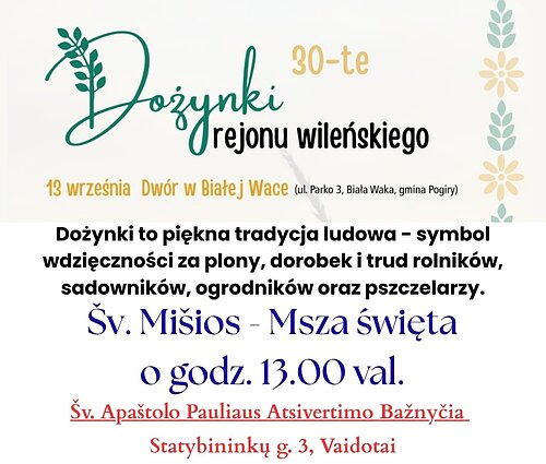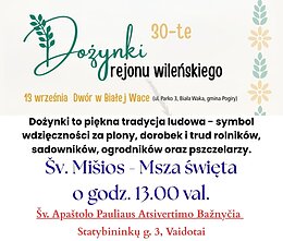 13 września o godz. 13:00 zapraszamy do Dworu w Białej Wace, gdzie rozpoczną się 30. Dożynki Rejonu Wileńskiego.