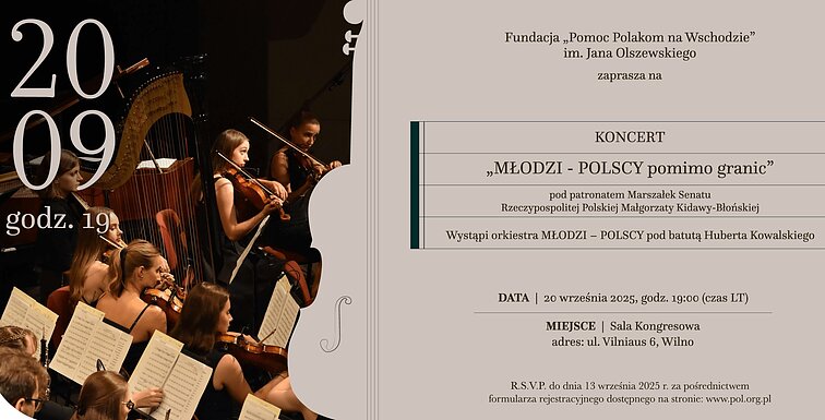 Już 20 września o godz. 19:00 w Sali Kongresowej w Wilnie (ul. Vilniaus 6, Wilno) wystąpi orkiestra MŁODZI – POLSCY. Jest to projekt, w którym już po raz szósty, na scenie spotykają się młodzi muzycy polskiego pochodzenia z Litwy, Białorusi, Łotwy, Niemiec, Ukrainy oraz Polski. Ich wspólne muzykowanie, pod batutą dyrygenta Huberta Kowalskiego, zaowocuje koncertem pełnym emocji i wyjątkowej muzyki. W programie znajdą się dzieła m.in. Wojciecha Kilara, Zbigniewa Wodeckiego, Grażyny Bacewicz, Stanisława Moniuszki, Krzysztofa Pendereckiego oraz Mieczysława Karłowicza.