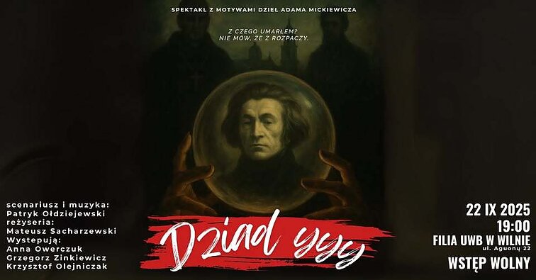 Spektakl „Dziad yyy” to opowieść o dwóch bohaterach, którzy wyruszają w niezwykłą podróż w poszukiwaniu śladów polskiego wieszcza. Ich wędrówka prowadzi przez wileńskie zaułki i ezoteryczne doświadczenia, zmuszając do konfrontacji z własnym wnętrzem, lękami i pytaniami wykraczającymi poza zwykłą percepcję. A wszystko to utkane z fraz, obrazów i energii dzieł Mickiewicza.