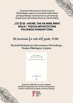 Centrum Polonistyczne Uniwersytetu Wileńskiego zaprasza wszystkich miłośników poezji polskiego romantyzmu na prezentację książki prof. Bernadetty Kuczery-Chachulskiej „Co żyje, niknie - tak na mnie świat woła”. Poezja metafizyczna polskiego Romantyzmu.