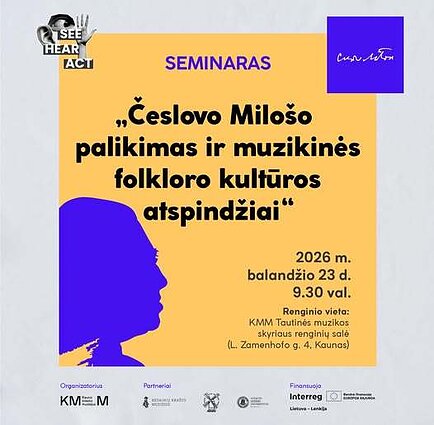 Zapraszamy do udziału w seminarium „Dziedzictwo Czesława Miłosza i odzwierciedlenia muzycznej kultury folklorystycznej”, które odbędzie się 23 kwietnia o godz. 9:30 w sali Muzeum Muzyki Narodowej Muzeum Miasta Kowna.