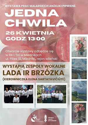 Podczas wydarzenia będą Państwo mieli okazję zanurzyć się w świecie kolorów, nastrojów i ulotnych chwil ukazanych w twórczości artystki oraz poczuć wyjątkową, kulturalną atmosferę. W trakcie wydarzenia wystąpią zespoły wokalne „Lada” oraz „Brzózka” (kierownik – Elena Sartatavičiūtė).