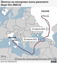 17 мая тот же борт вылетел из «Внуково» и направился в Рим: Ольга Любимова должна была представлять Россию на инаугурационной мессе папы римского Льва XIV. Однако, судя по данным Flightradar24, самолет развернулся в Средиземном море неподалеку от египетской Александрии и вернулся в Москву.