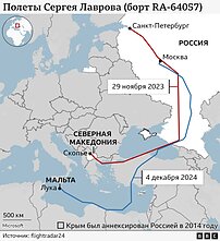 Сложнее было с маршрутом Лаврова на саммит ОБСЕ за год до этого, в ноябре 2023-го. Тогда мероприятие проходило в Скопье — столице Северной Македонии. В довоенные времена маршрут из Санкт-Петербурга в Скопье пролегал над несколькими странами ЕС, включая Литву и Польшу, ожидать от которых согласия пропустить российский борт было бы малореалистичным.